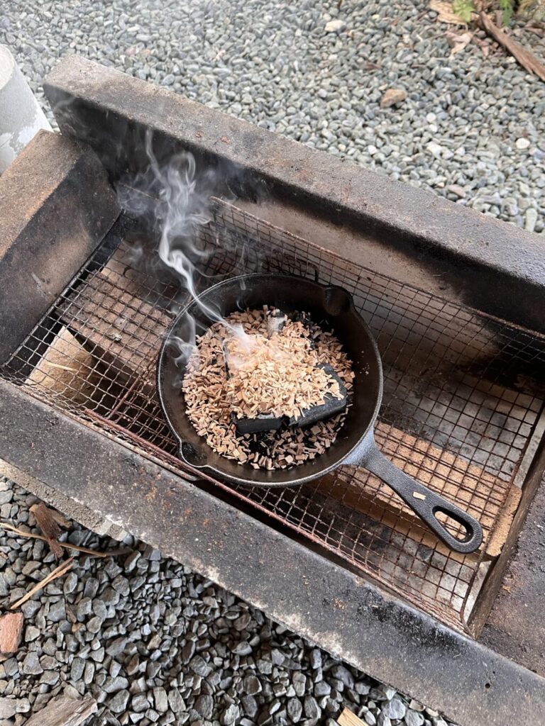 U字溝の上に燻製器を載せ、スキレットで炭を燃やしてそこにチップを加えていくスタイルとしました。