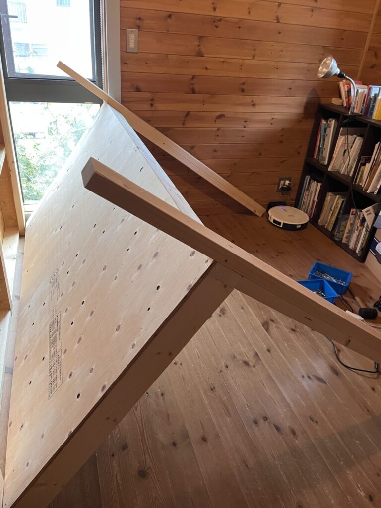今回作ったベッドの部屋は勾配屋根になってて、最も高いところで90cm確保できてて最も低いところでは70cm以下。