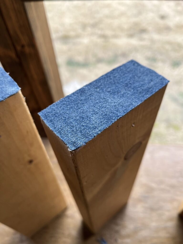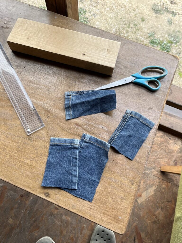 ジーパンの端切れをこんな感じで使う時は切りっぱなしのところからほつれてきますので、ボンドを薄めた液を作って端に塗っておきます。