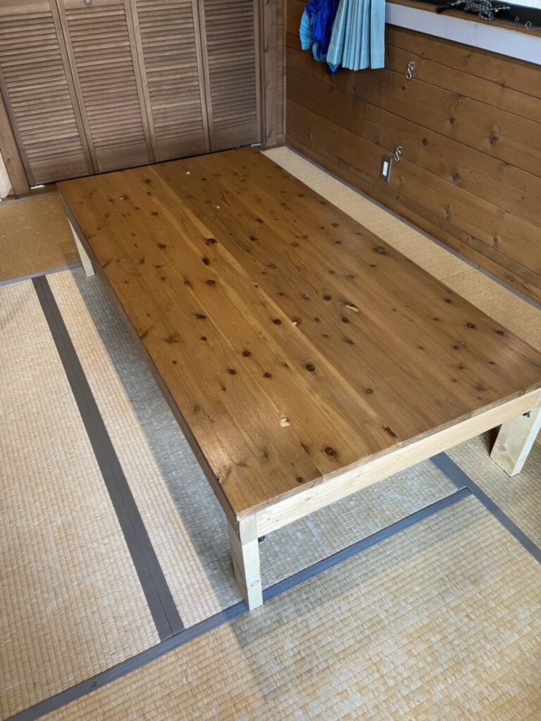 ほんとはコタツで寝るのを考えるともう少し高くしたかったんですが、あまり高くすると宴会したり子が宿題したり遊んだりする時に高すぎるかなと思いまして。