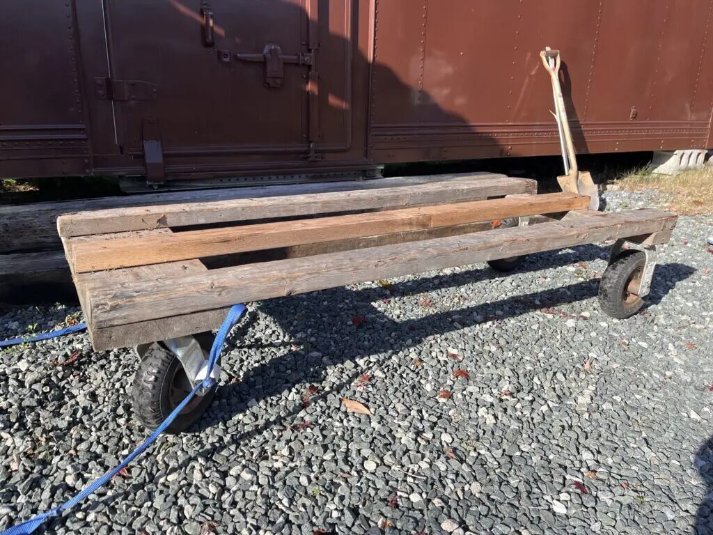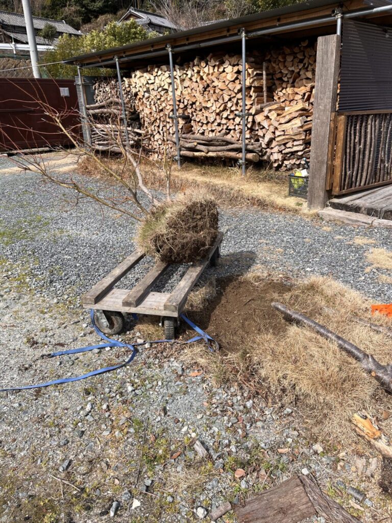 庭で枕木や丸太、今回の植木みたいに重量物を運ぶ時に使ってる台車です。