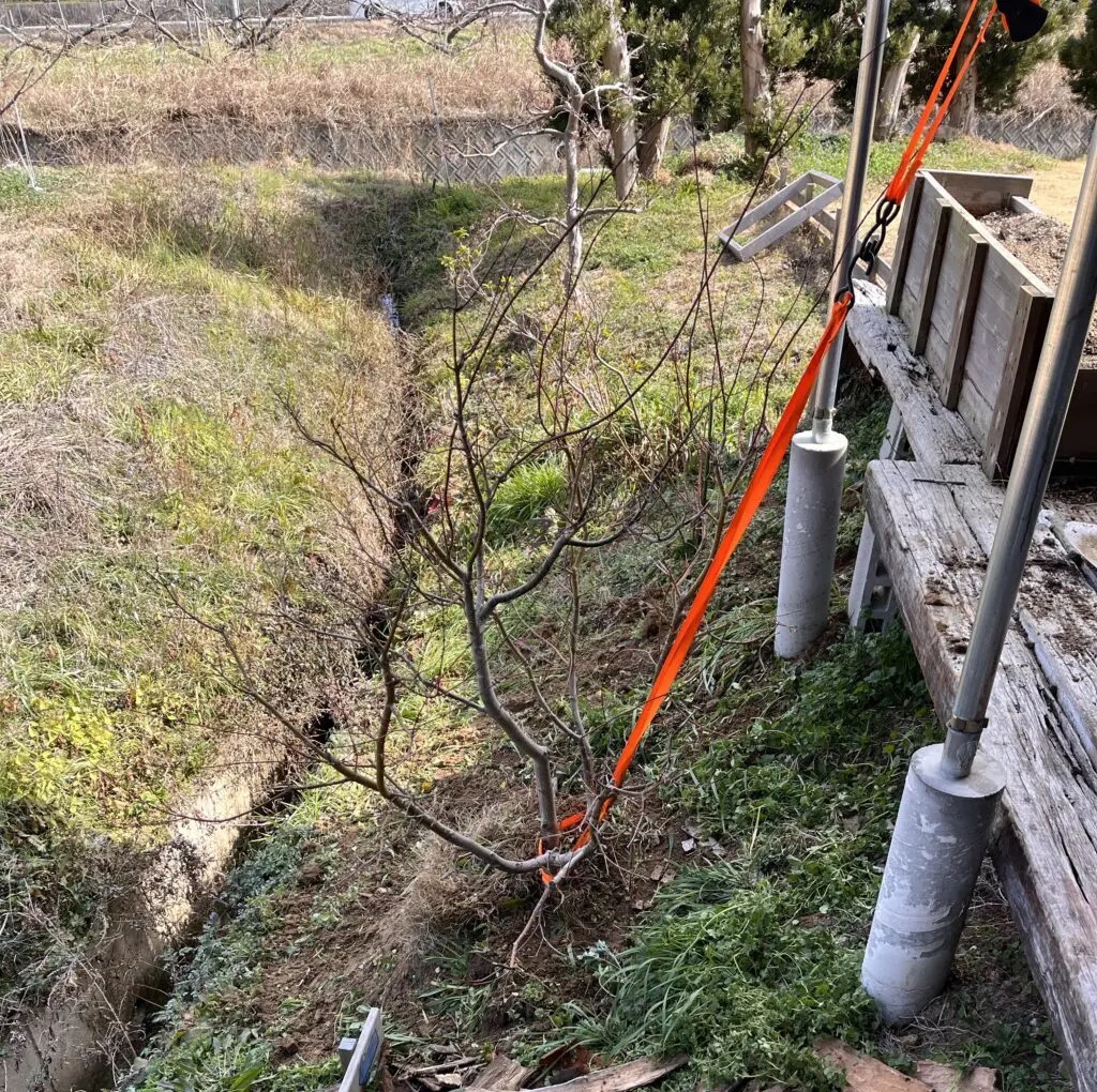こういうものを植木の根本に巻き付けて、車で引っ張ります。(今回は軽かったので自分で引っ張り上げた。)