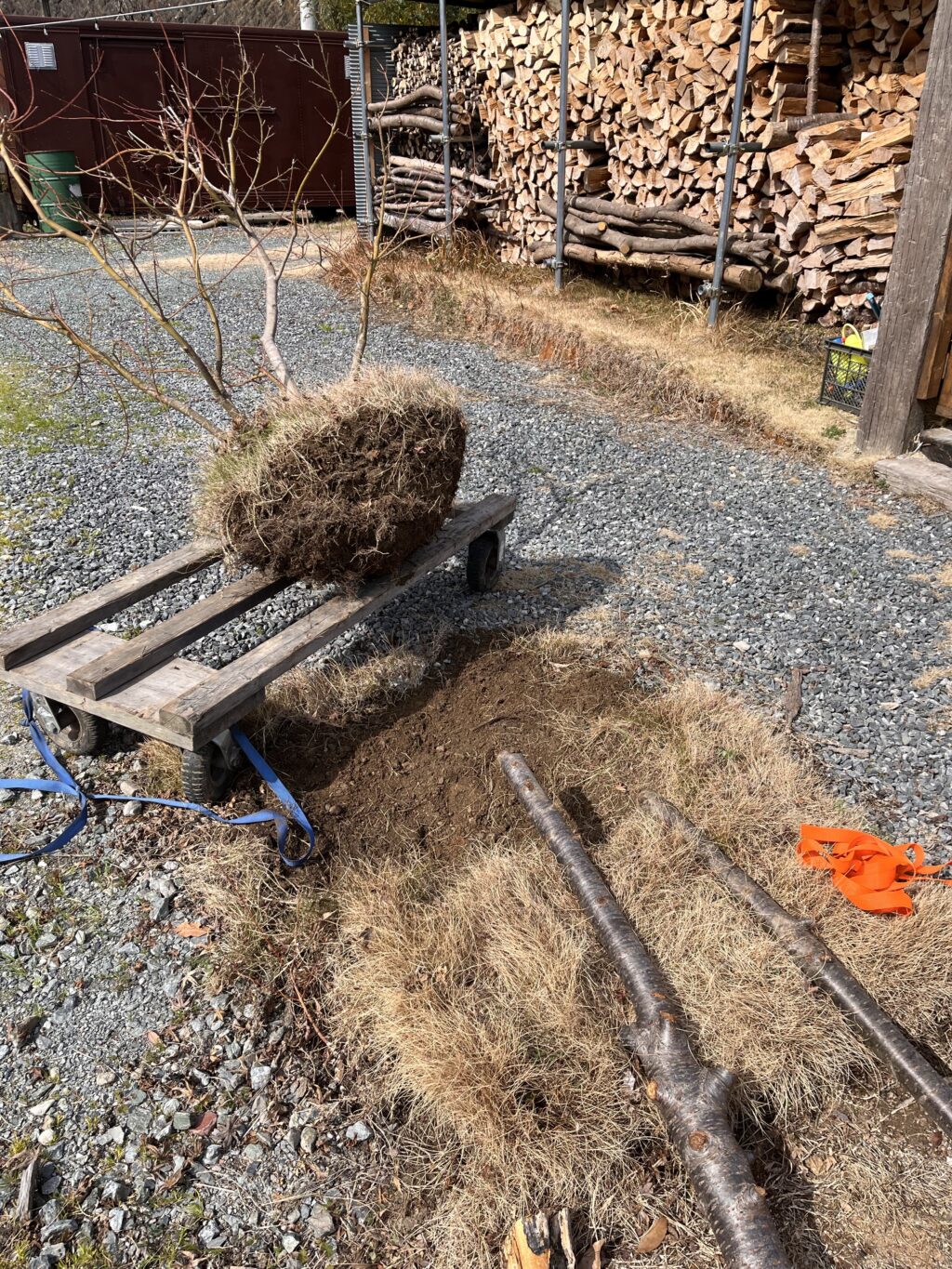 庭で枕木や丸太、今回の植木みたいに重量物を運ぶ時に使ってる台車です。